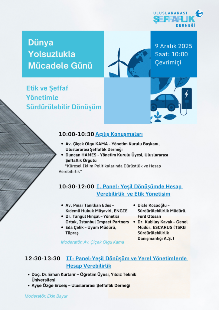 Uluslararası Şeffaflık Derneği olarak bu yılki 9 Aralık programımızla hem ulusal hem yerel düzeyde yeşil dönüşümün hesap verebilirlik mimarisine katkı sunmayı amaçlıyoruz.