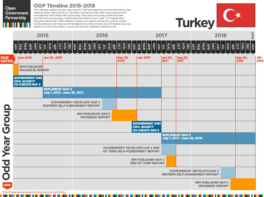 2015-2018 dönemi için yayınlanan takvime göre, 2015 yılı Temmuz ayına kadar Türkiye için bağımsız ilerleme raporunun hazırlanması ve hükümetin sivil toplumla işbirliği içinde 2. eylem planını hazırlaması beklenmektedir.